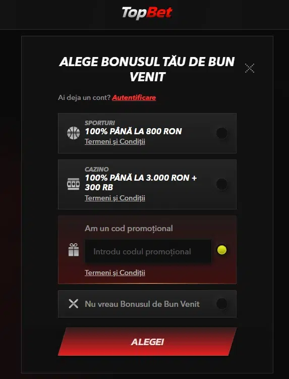 TopBet Casino își întâmpină noii jucători cu oferte de bun venit extrem de avantajoase, ce includ bonusuri generoase la depunere și rotiri gratuite. Utilizarea unui TopBet Cod Promotional poate amplifica aceste avantaje, oferindu-ți posibilitatea de a maximiza câștigurile fără a cheltui fonduri suplimentare. TopBet Cod Bonus este ușor de aplicat în momentul înregistrării, oferind acces instant la beneficii suplimentare. Asigură-te că aplici codul promotional corect pentru a te bucura la maximum de ofertele disponibile pe platformă.